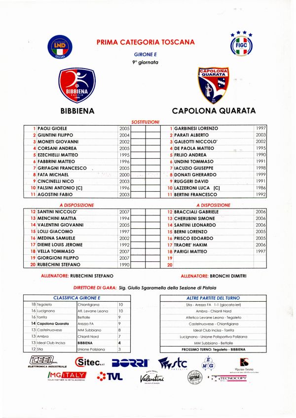 | Bibbiena | 7 | 9 | 2 | 1 | 6 | 8 | 21 | -13 | |